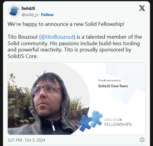Inspired by Ryan Carniato This Week in JavaScript and Sébastien Lorber This Week In React, I plan to publish a compilation of updates, posts, and videos about the Solid world at the end of every month.