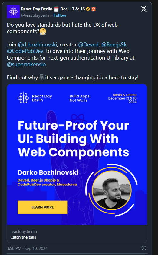 Darko will present his talk Future-Proof Your UI: Building With Web Components at React Day Berlin this December.