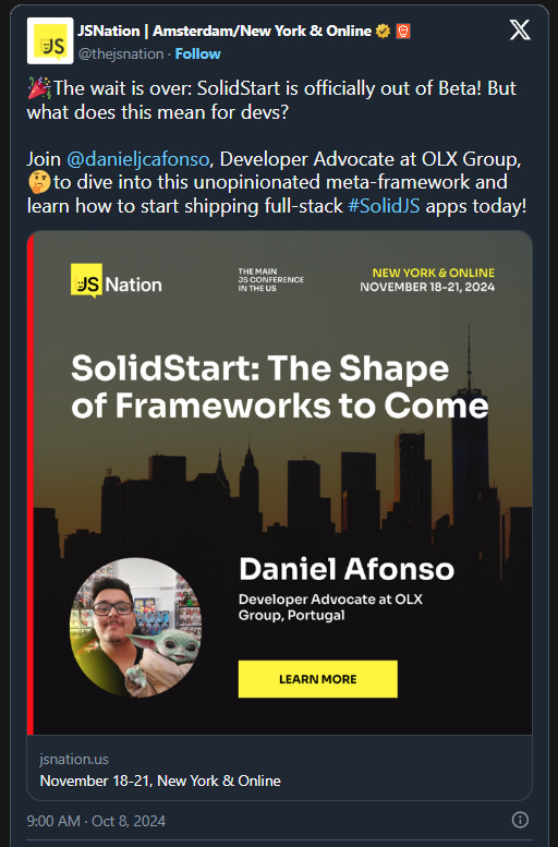 Daniel will present his talk SolidStart: The Shape of Frameworks to Come at JSNation US Remote Track this November 21st.
